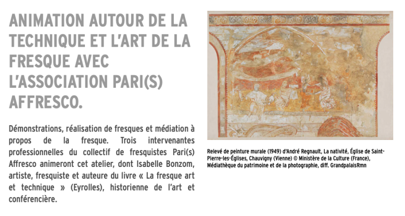 À la Médiathèque du Patrimoine et de la Photographie, des membres du collectif de fresquistes de Pari(s) Affresco réaliseront des fresques portatives inspirées de fresques du Moyen-Âge et de la Renaissance situées sur le territoire français et dont les Archives des Monuments historiques et de l'Archéologie conservent des relevés : Auxerre, Berzé-la-Ville, Château-Landon, Villeneuve d'Aveyron ou Le Puy-en-Velay.